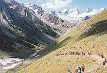 This is a 14 km. steep trek – one way. Only the very fit can go and come back the same day after trekking for 28 kms. It is possible to hire ponies or palkies. Baltal is, more popular because of its shorter distance.